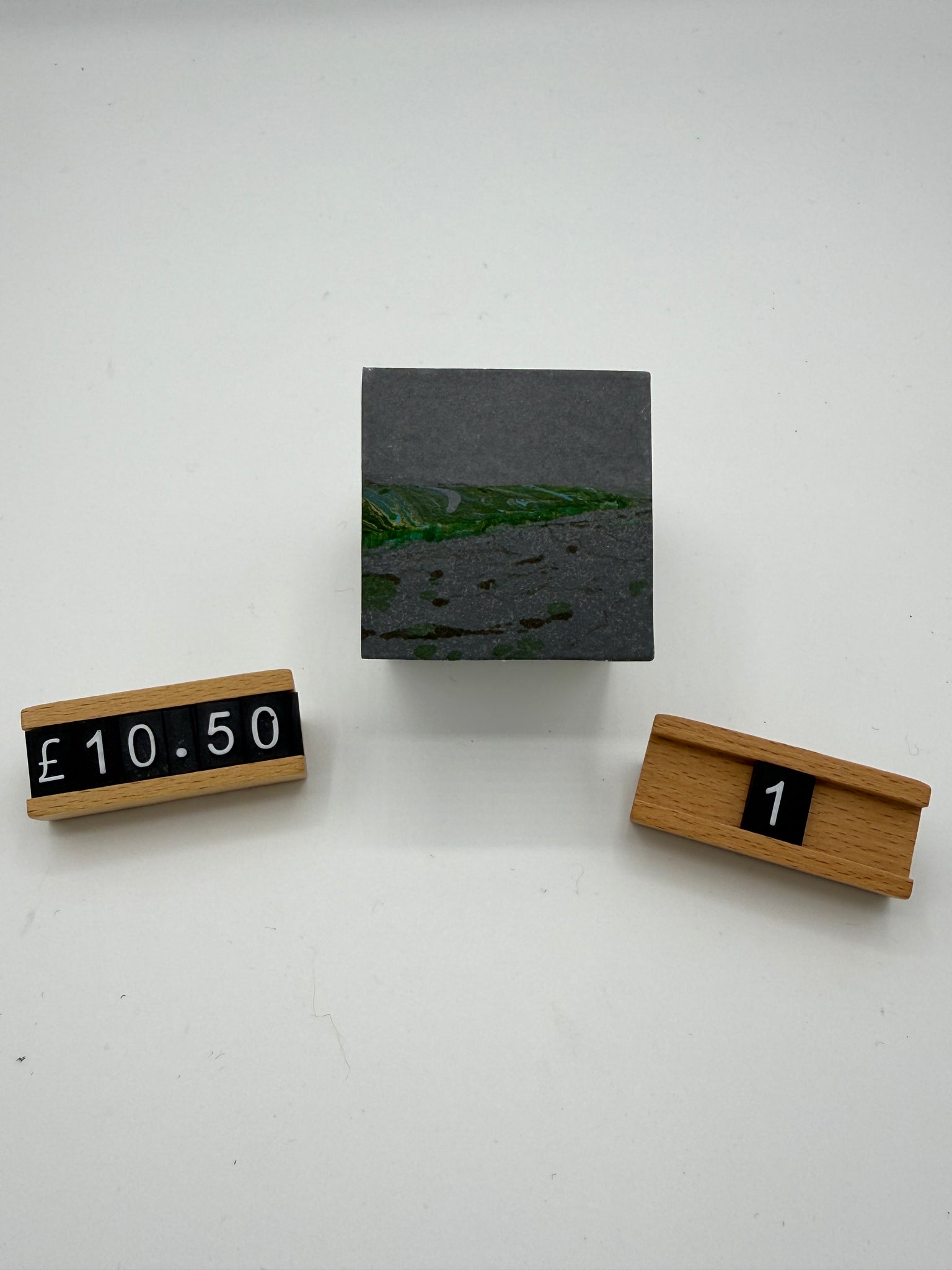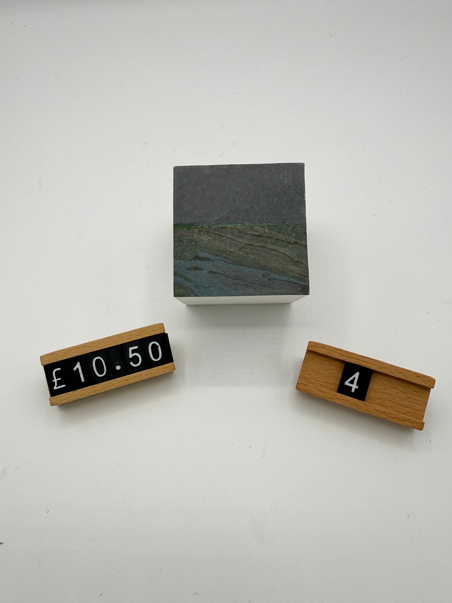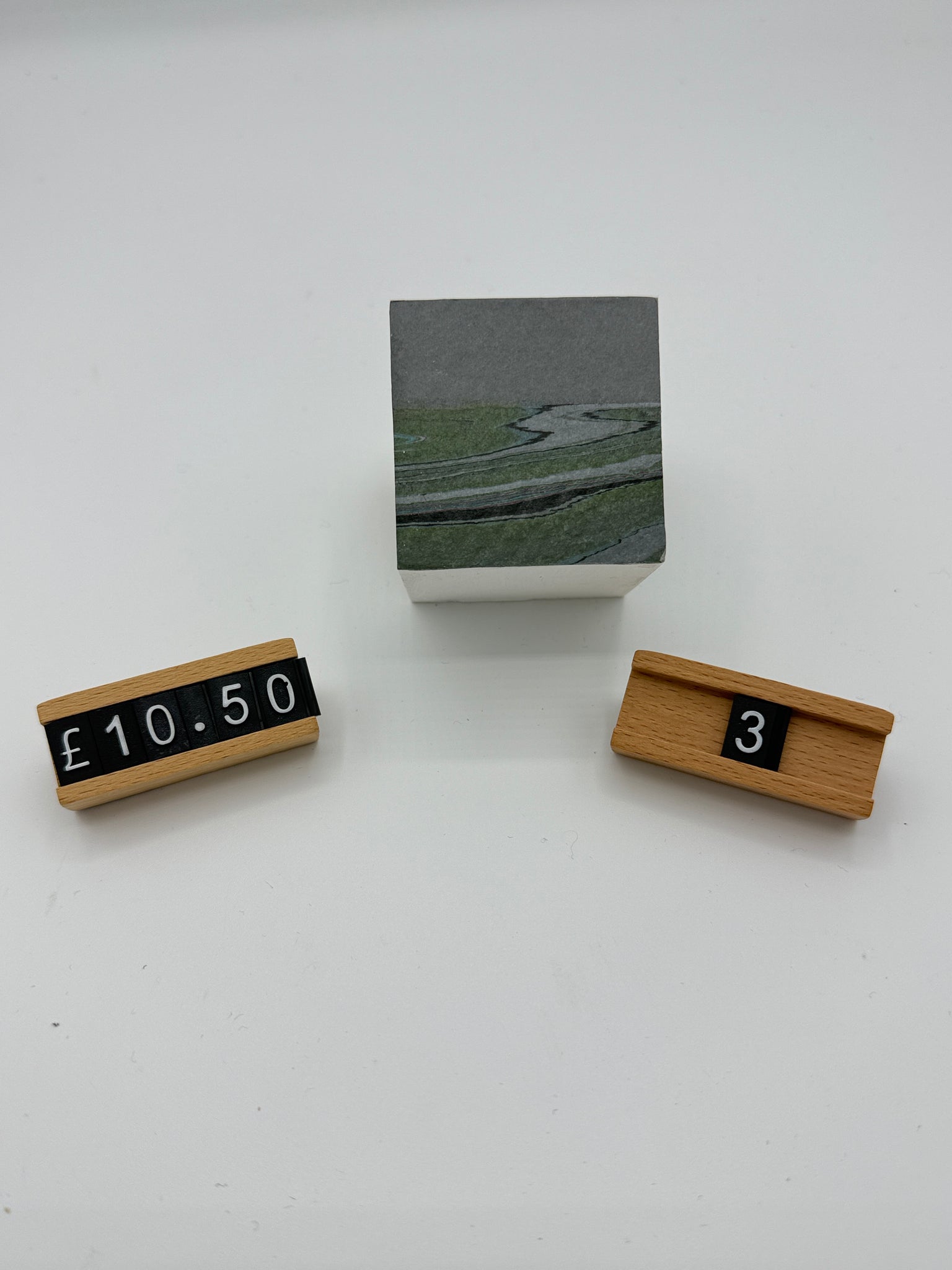 A sustainable way to create abstract landscapes or seascapes. These marbled paper artworks are affixed to painted wooden cubes.  Each pieces is created after a marbled pattern is transferred to paper or textiles, to use up the inks and paint left on the marbling bath water so no resources are wasted.
