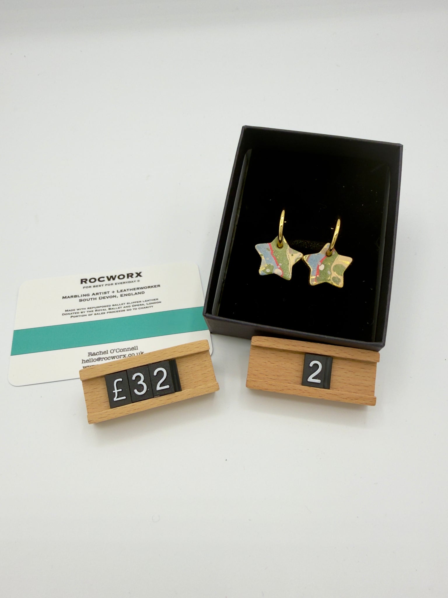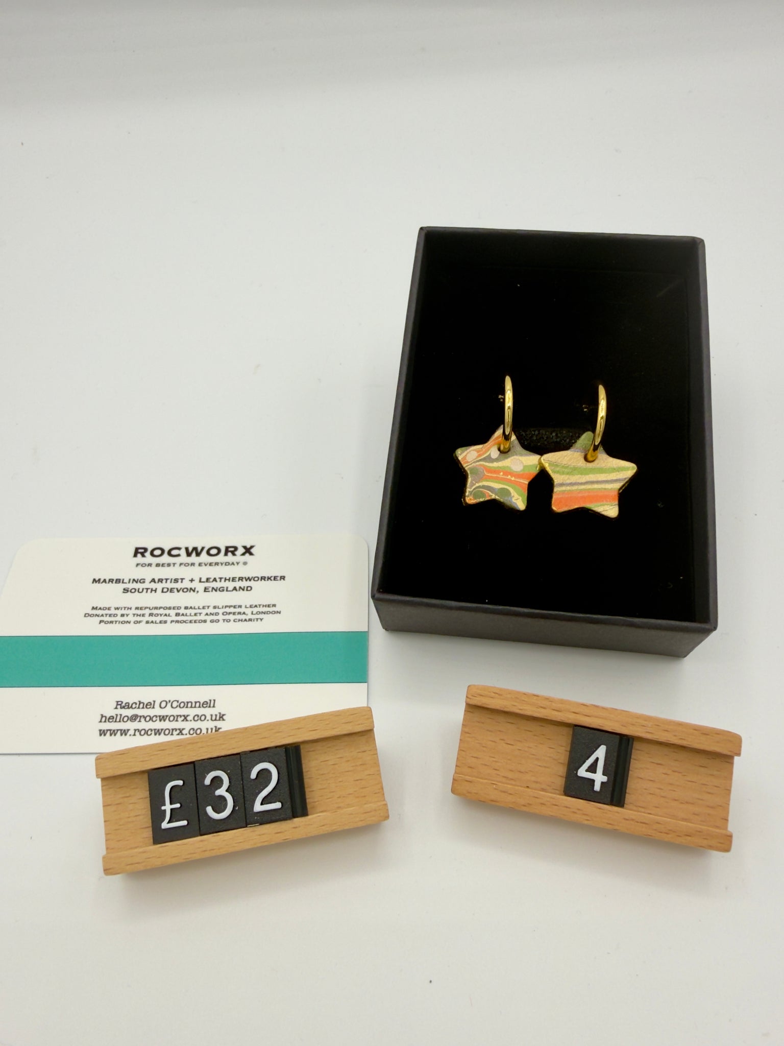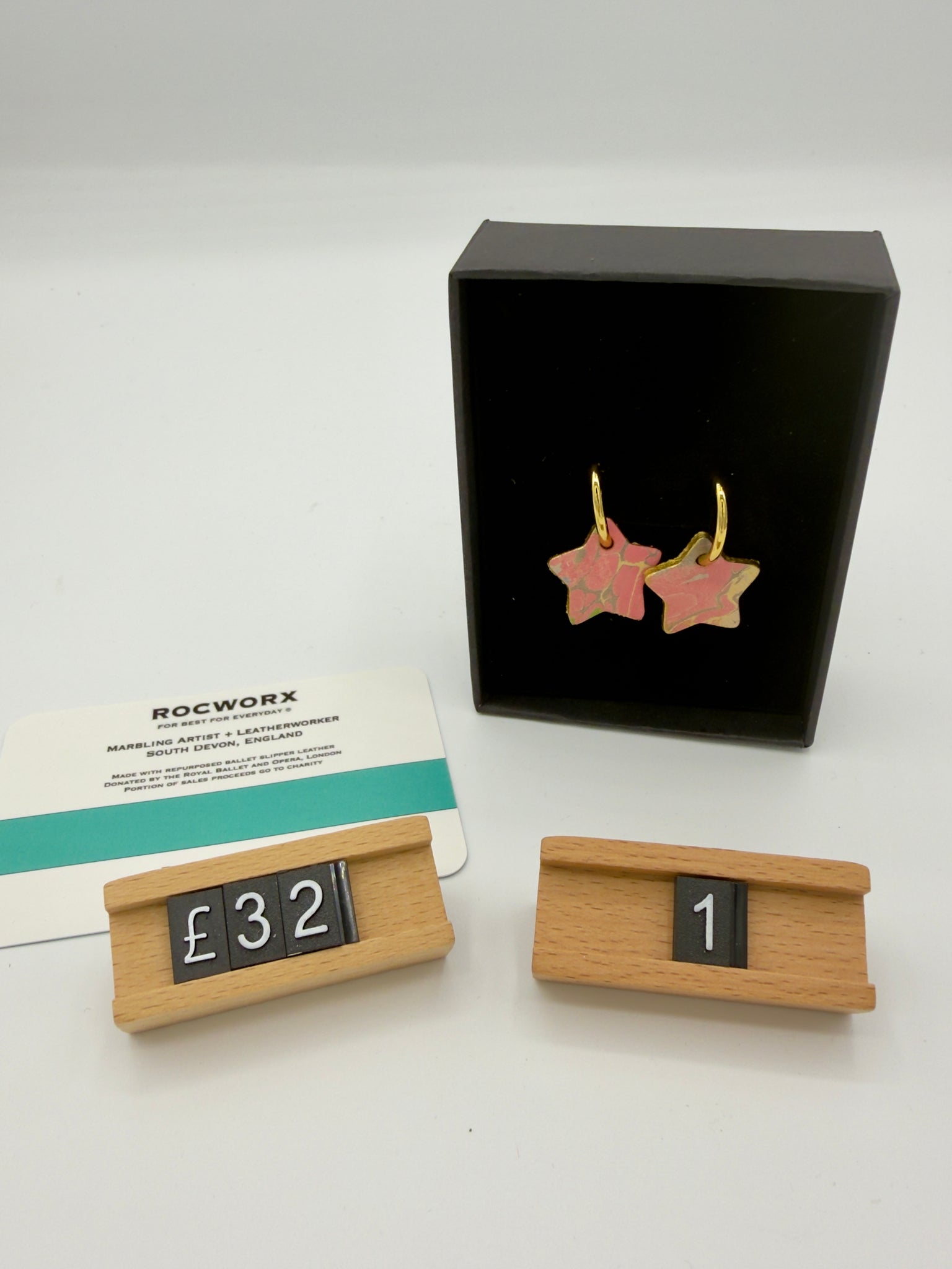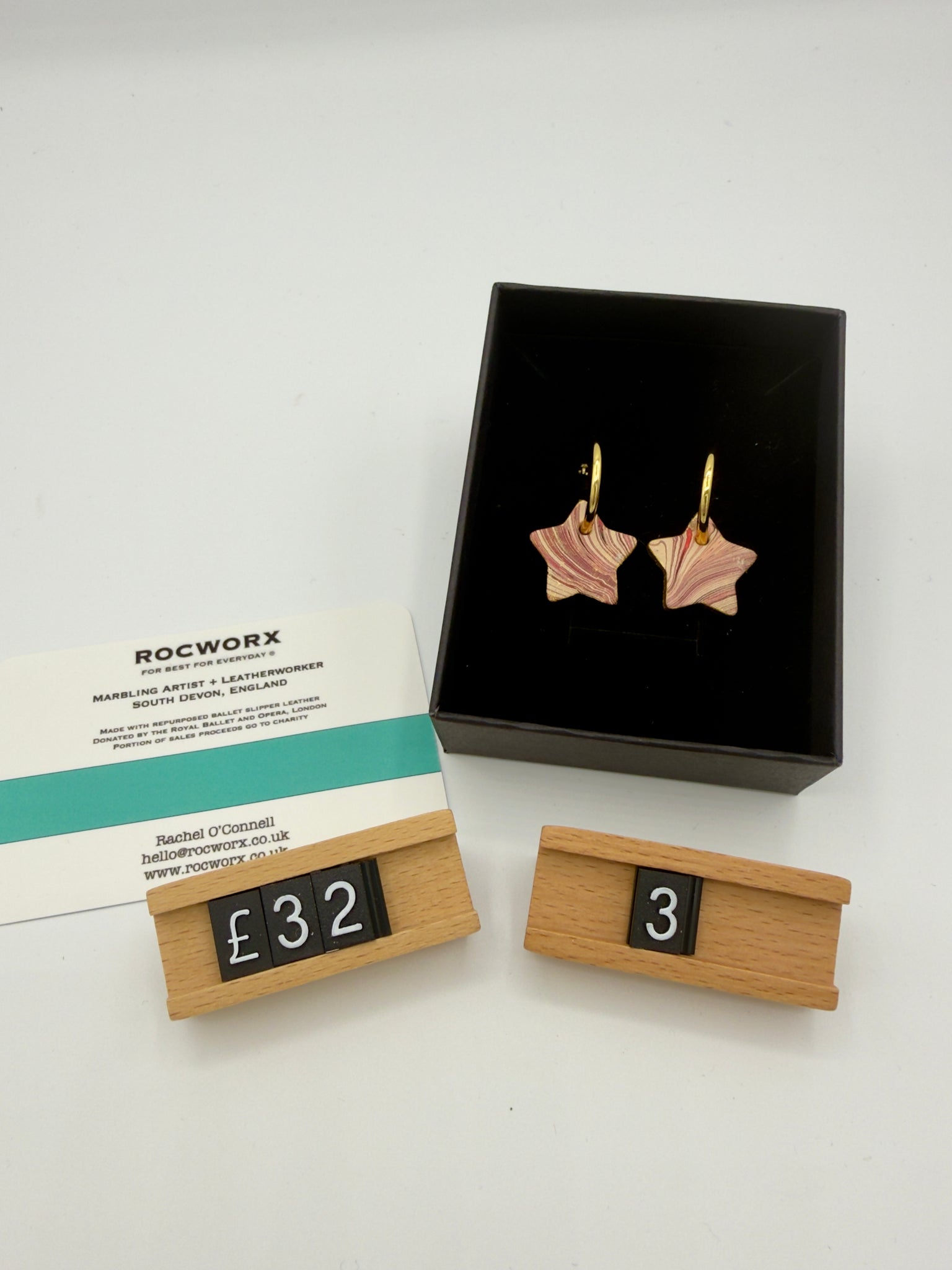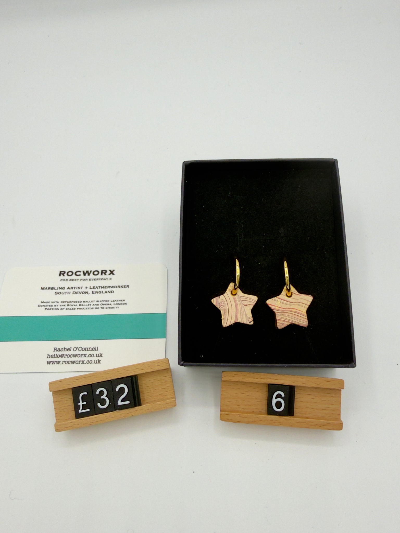 14k gold plated hoop earrings with repurposed marbled slipper leather star design.  The ballet slippers are kindly donated by a ballet company based in Covent Garden, London.  Each pair sold, support the incredible work of the food bank charity, The Trussell Trust (UK), through an annual donation.