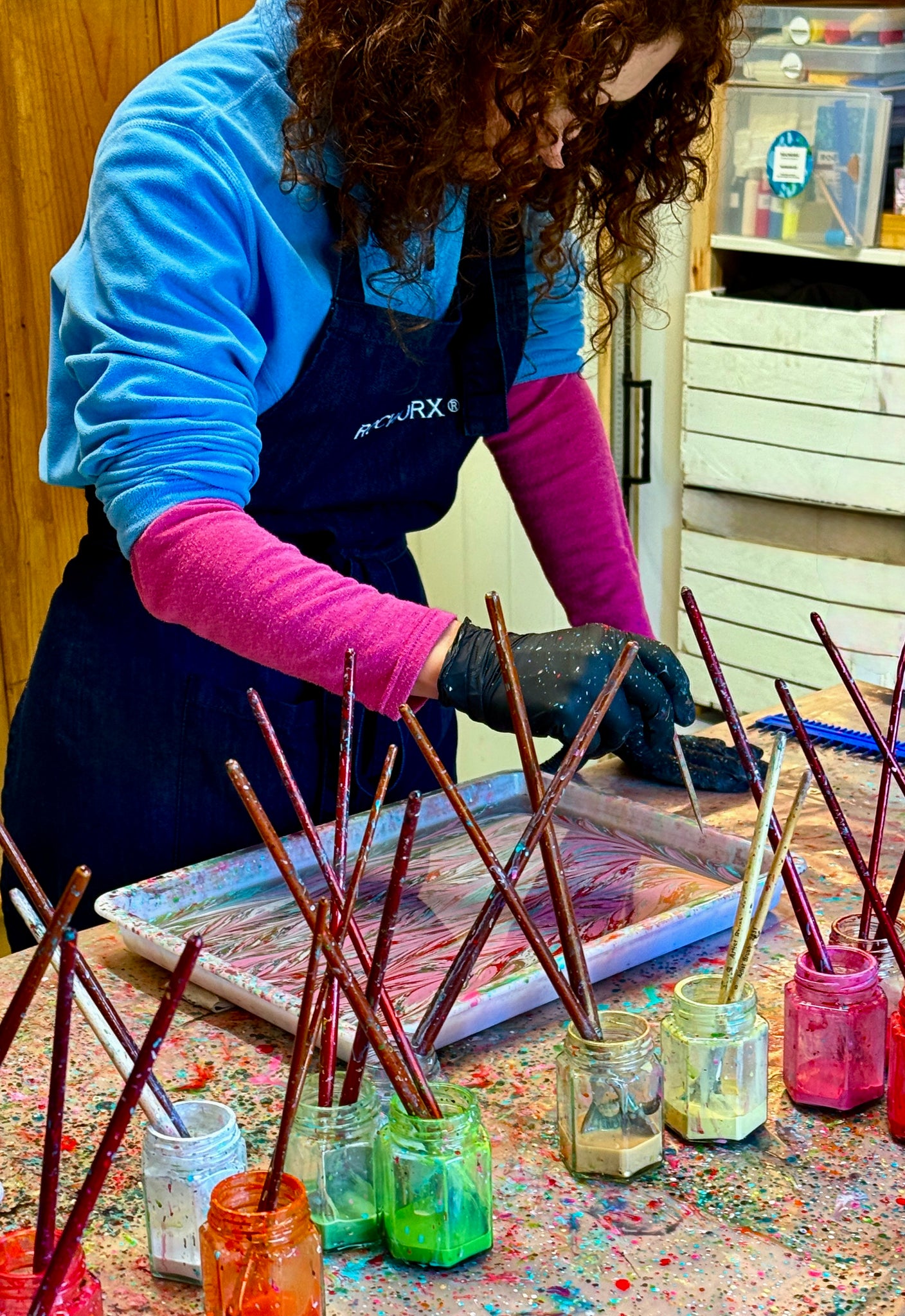 All materials, an apron and gloves are provided. I suggest wearing old clothing and old shoes, in case paint splashes. During the workshop, you will be required to stand over the marbling bath for some of the morning. If you have a disability, please let me know, so I may set up the workshop to accommodate your needs. Unfortunately the studio cannot accommodate a wheelchair.